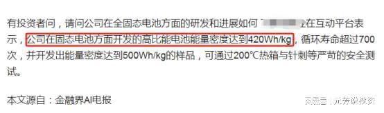 4月15日,长安汽车在互动平台表示,公司正在加快推进下一代电池开发,预计2026年实现固态电池装车验证,2027年推进全固态电池逐步量产,能量密度有望达到400Wh/kg。