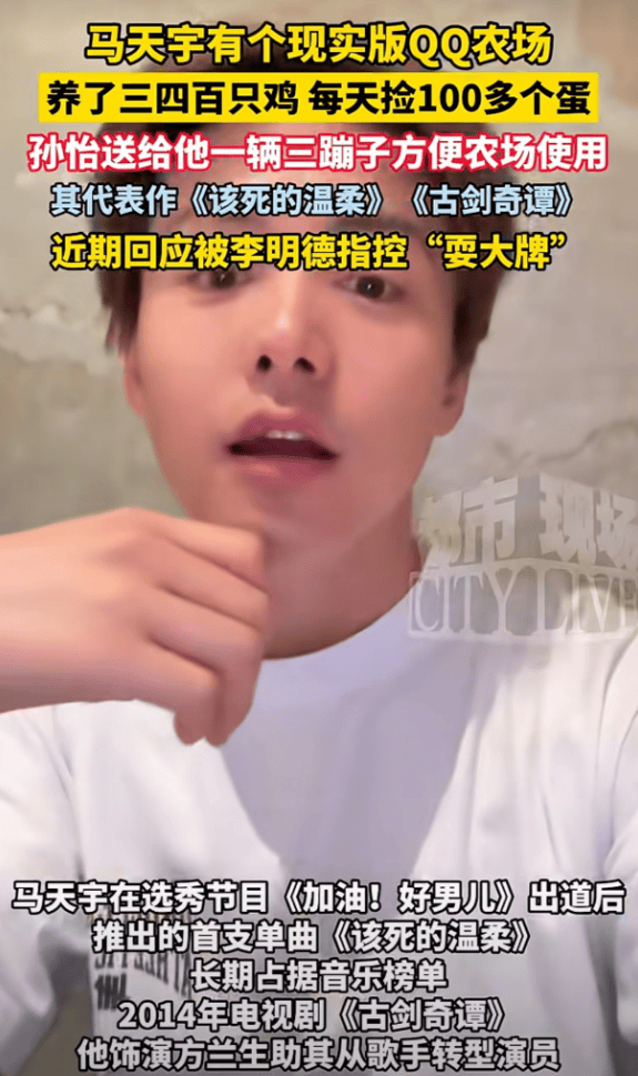 近日,39岁男星马天宇在节目中首次公开自己在北京郊区的农场,草莓、葡萄、西红柿、茄子、辣椒、小麦等等应有尽有,养了三四百只鸡,每天能捡100多枚鸡蛋,被网友称为“现实版的qq农场”。马天宇曾发视频展示自己在农场的一天,称自己不工作的时候基本都会待在这里。